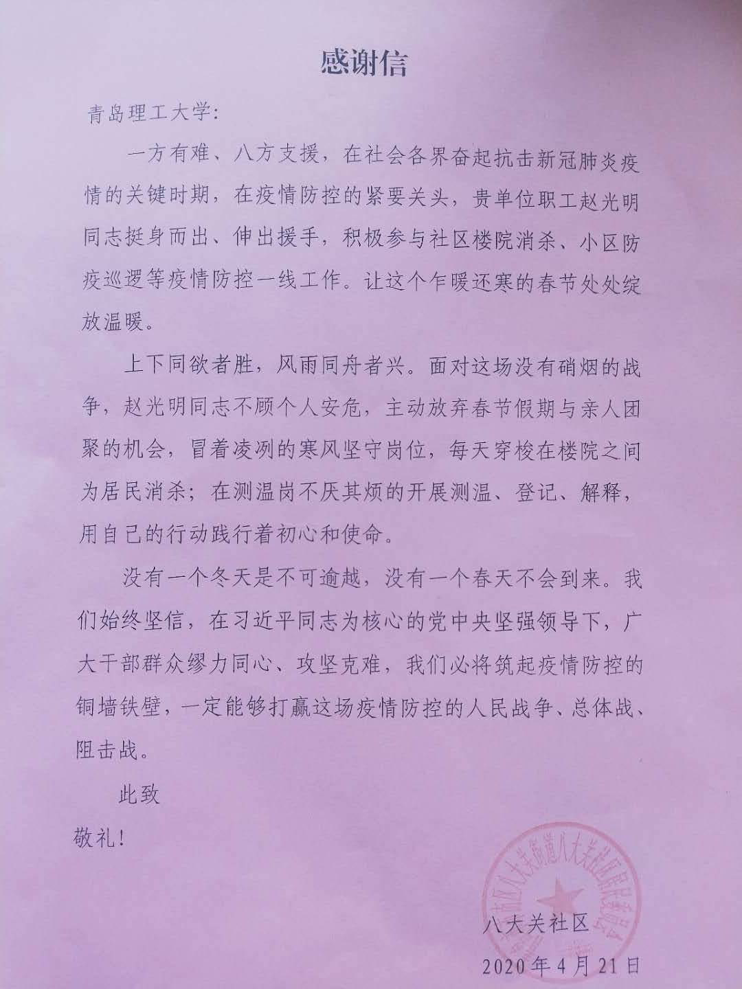 近日,公司收到八大关社区发来的感谢信,信中对公司伟德BV官网赵光明老师主动参与社区疫情防控工作进行了表扬与感谢。