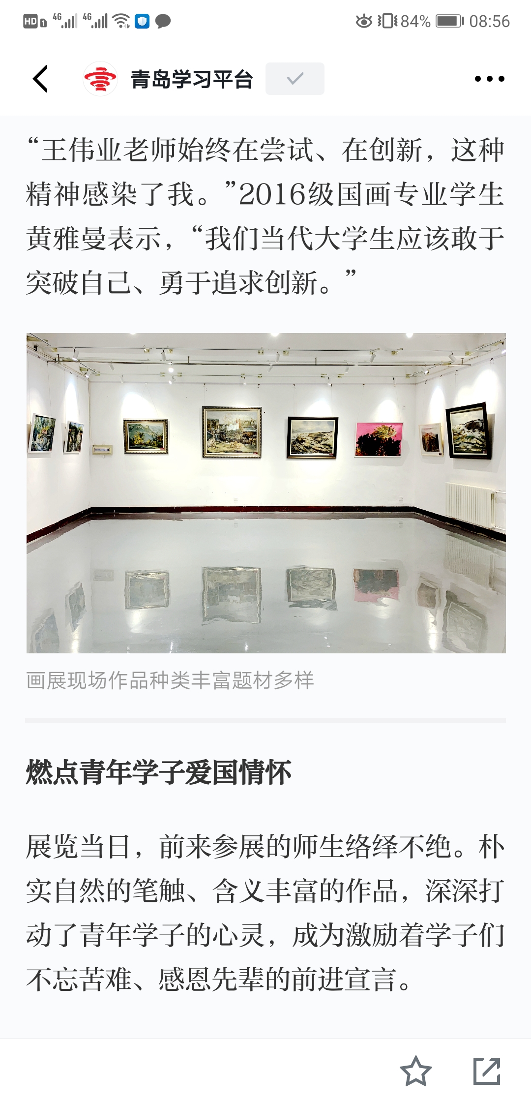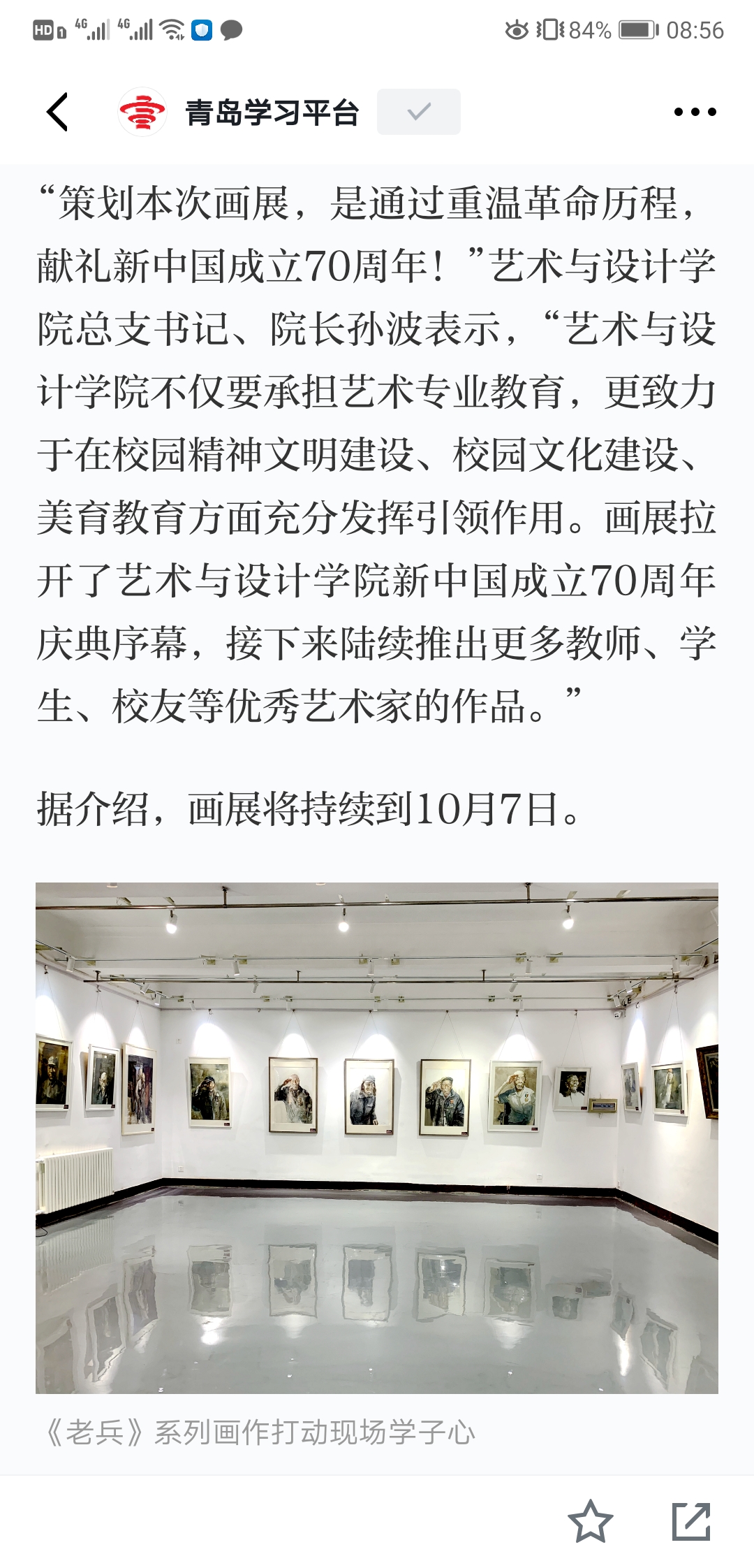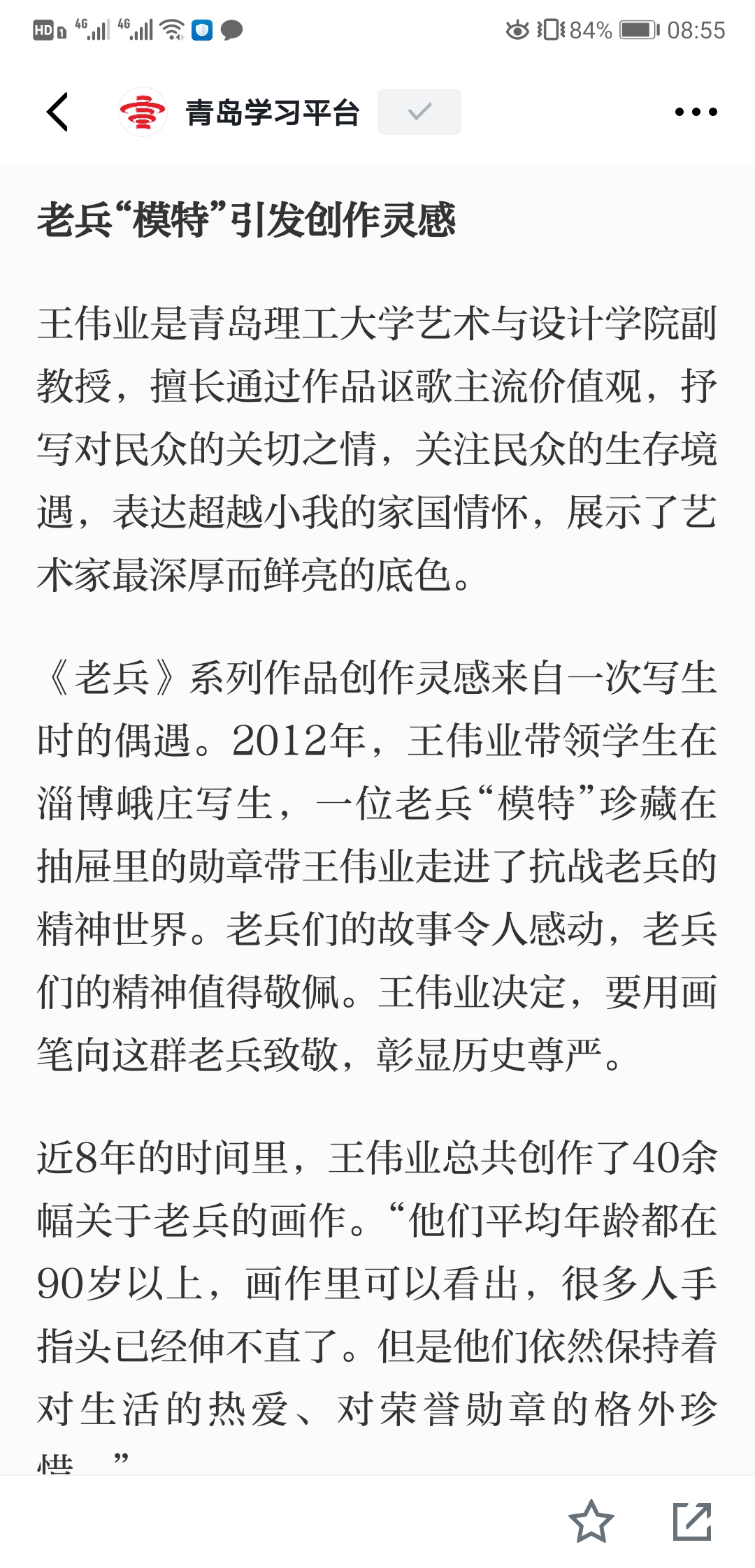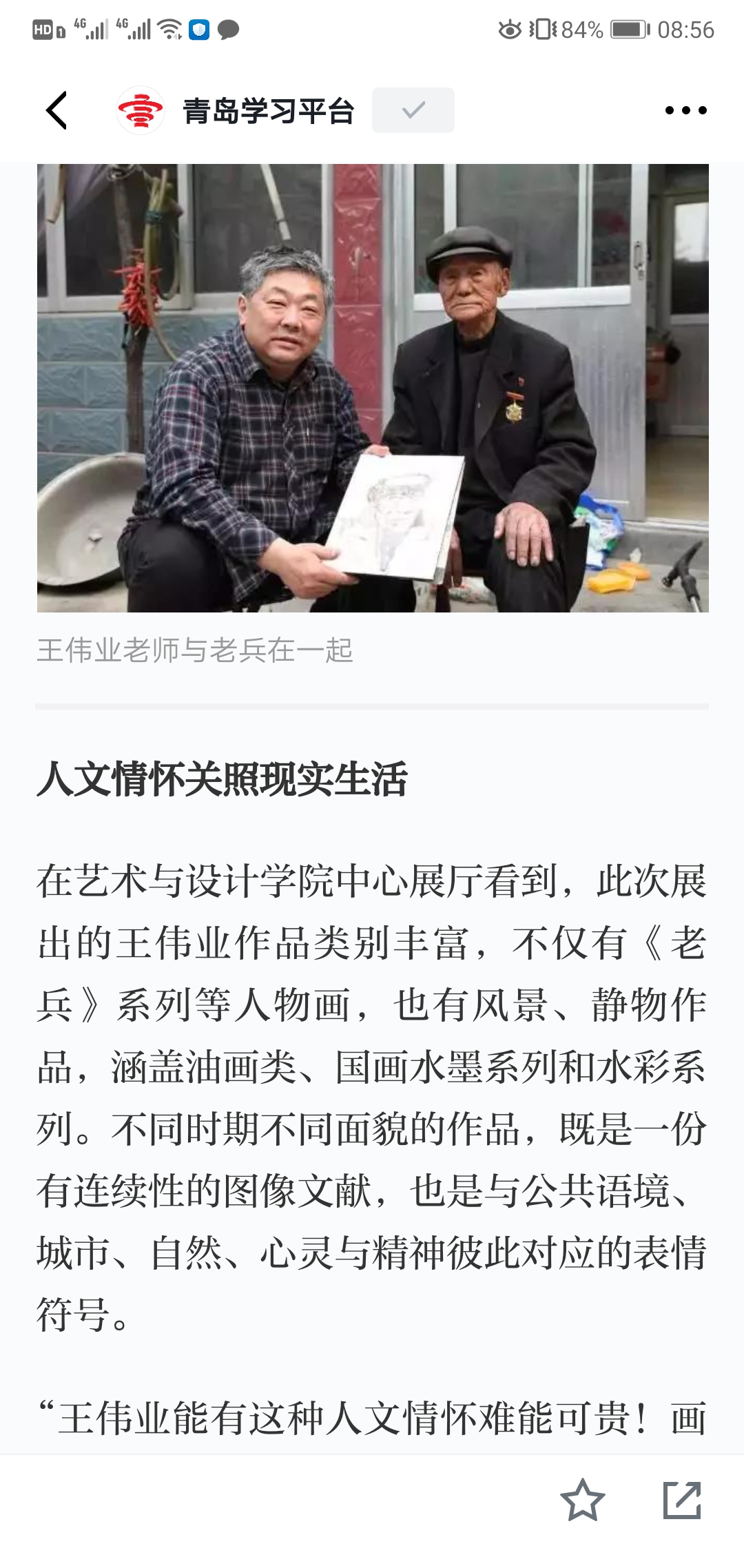 油画161班员工李朝霞表示,王老师的画展表达了老兵背后的故事,老兵在战争中抛头颅、洒热血,为国奋战、不惜牺牲,我们应该向老兵致敬!鲜活的人生故事和亲切的生命体验,能够赋予一件作品灵魂。“我们要向老师学习,把自己的创作赋予人文关怀和精神内涵,不忘初心、牢记使命,砥砺前行!”