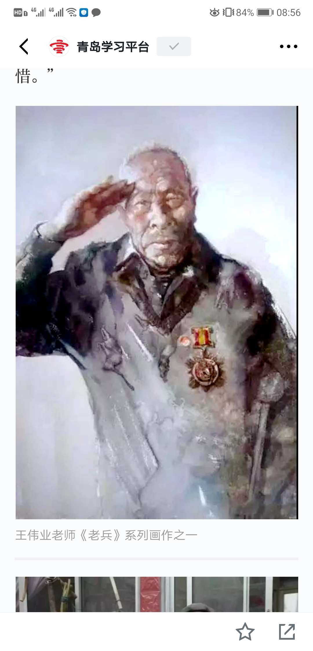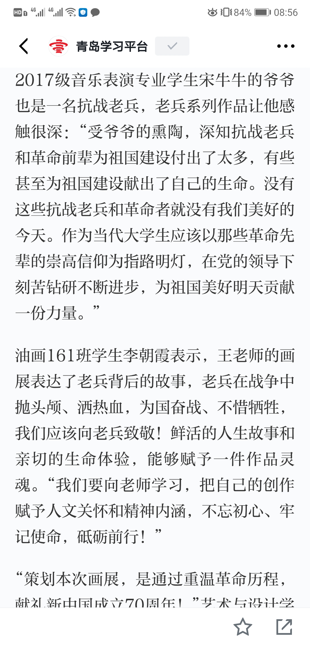 2017级音乐表演专业员工宋牛牛的爷爷也是一名抗战老兵,老兵系列作品让他感触很深:“受爷爷的熏陶,深知抗战老兵和革命前辈为祖国建设付出了太多,有些甚至为祖国建设献出了自己的生命。没有这些抗战老兵和革命者就没有我们美好的今天。作为当代老员工应该以那些革命先辈的崇高信仰为指路明灯,在党的领导下刻苦钻研不断进步,为祖国美好明天贡献一份力量。”