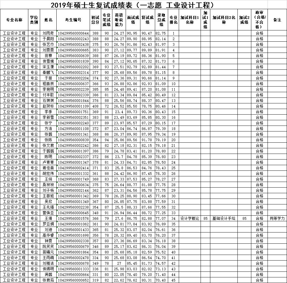 2019年硕士研究生复试成绩表-调剂 工业设计工程
