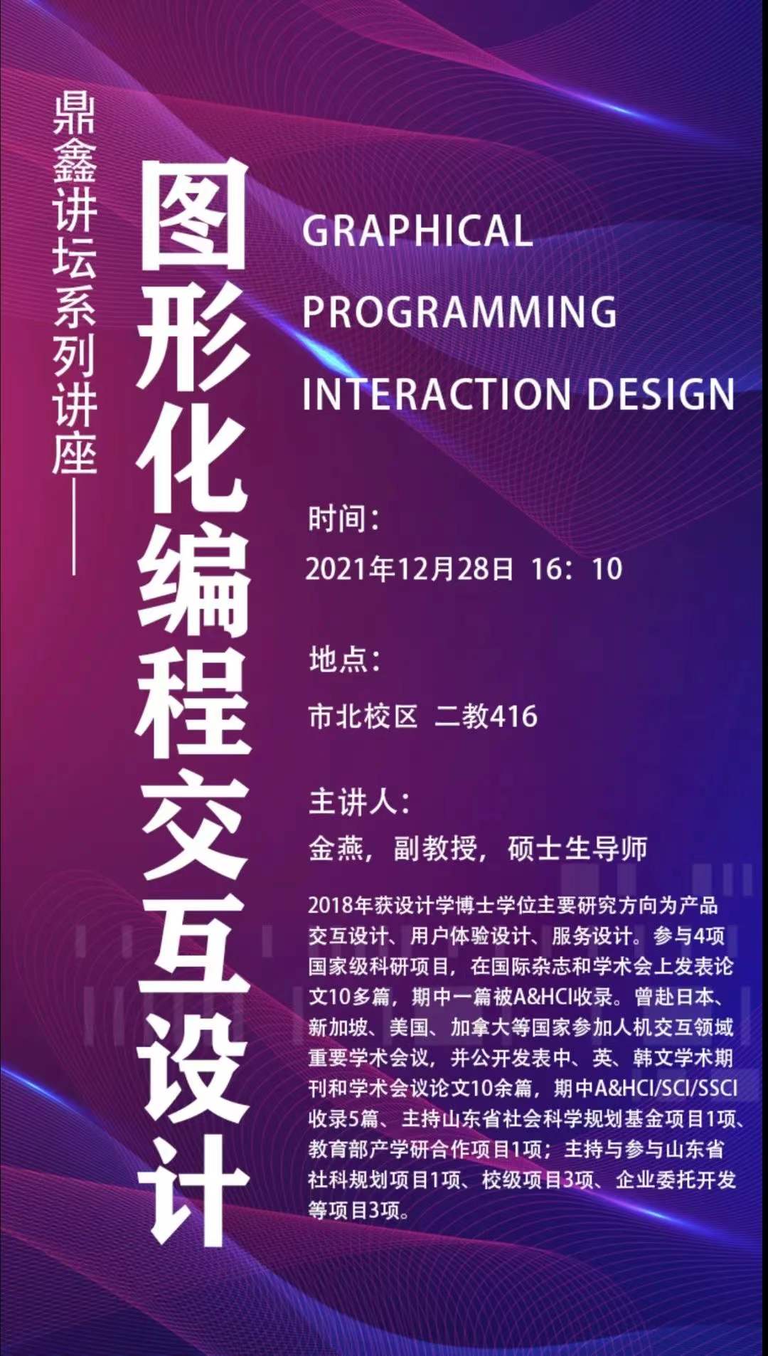 为更好地营造浓郁校园学术文化氛围,12月28日下午,鼎新讲坛系列讲座在伟德BV官网市北校区二教416成功举行,伟德BV官网副教授,硕士生导师金燕老师以人机交互设计为切入点,结合编程语言,进行了《图形化编程交互设计》为题的学术讲座,伟德BV官网员工及部分青年教师参与了本次讲座。