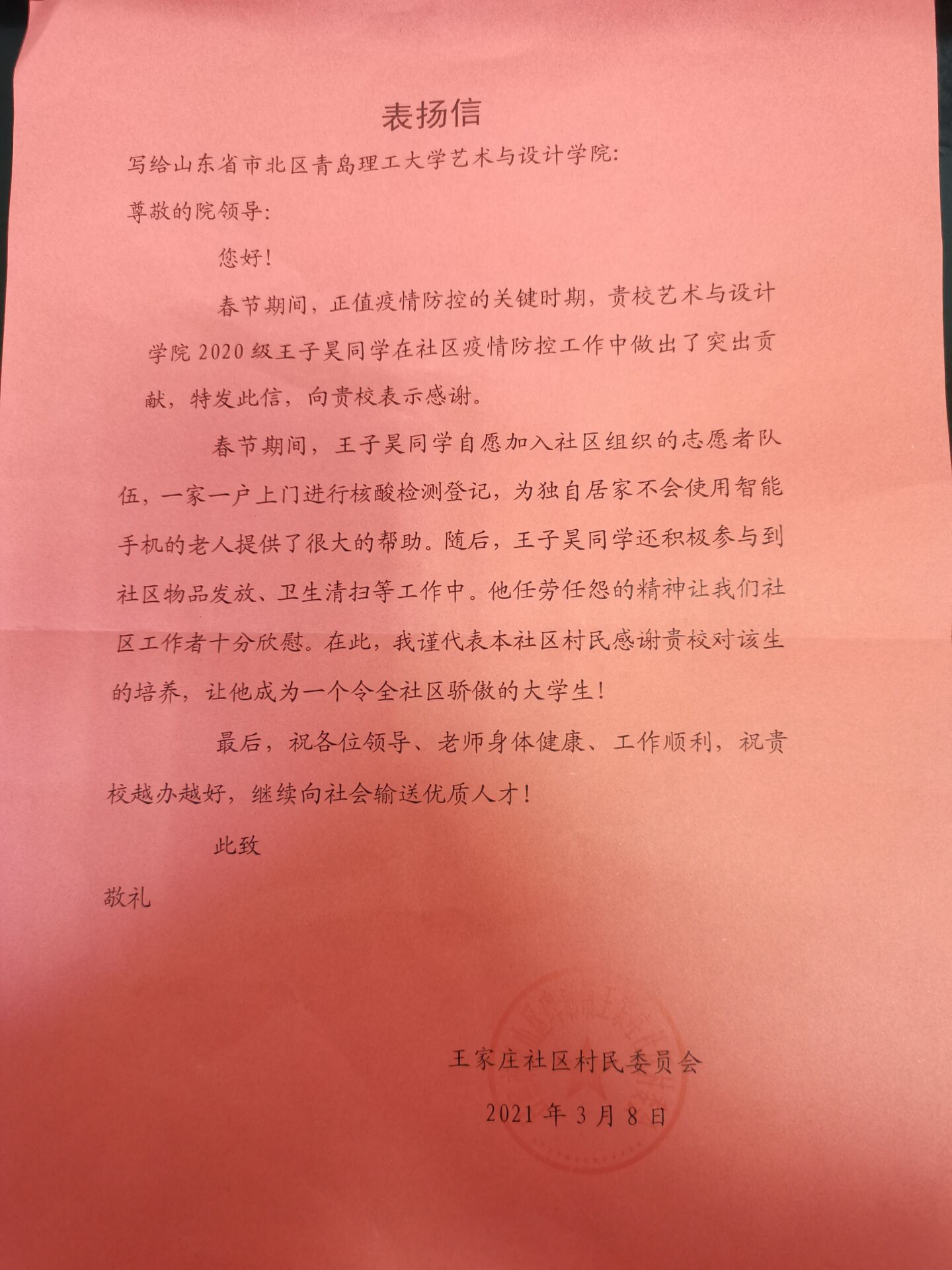3月23日,伟德BV官网收到一封表扬信,该信来自日照市岚山区王家庄社区村民委员会,信中对伟德BV官网2020级艺设205班王子昊同学在寒假社区疫情防控工作中的突出表现进行了表扬。