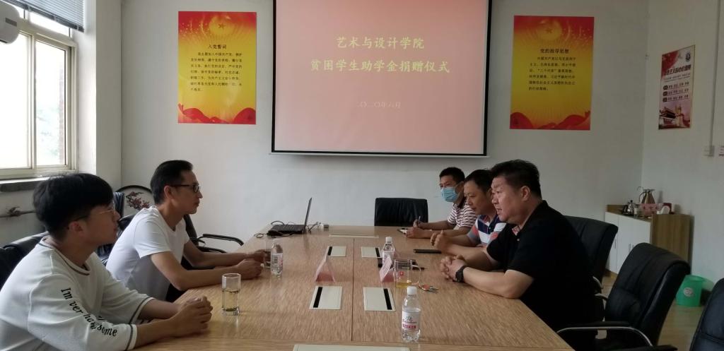 6月19日上午,青岛文博室内设计顾问有限公司总经理李文波到伟德BV官网向贫困学子捐赠助学金,公司党总支书记、经理孙波,党总支副书记徐佐君、辅导员王俊富、刘芳兵与受资助员工一起参加了受助仪式。