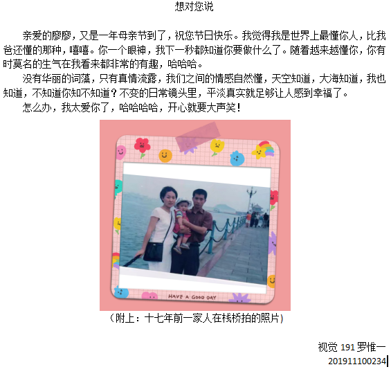 母爱,任你肆意索取,却从不求报答;母亲,任凭风吹浪打,历经千辛万苦也心甘情愿。此次活动旨在弘扬孝敬父母、珍视亲情的传统美德,引导员工从理解、关心父母开始,培养员工感恩之心。鼓励青年学子在学习上奋发进取,以实际行动去报答母亲的养育之恩,报效祖国母亲,同心共筑中国梦。(撰稿:罗惟一、王俊富;审核:徐佐君)