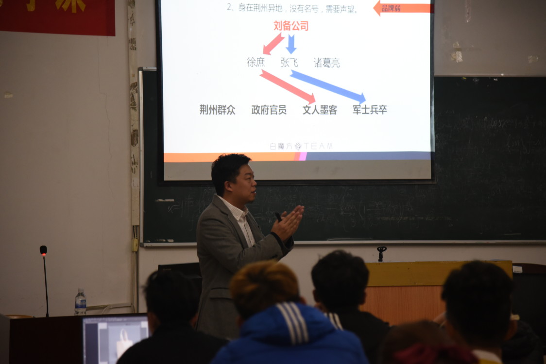 讲座伊始,王秉全简要地给同学们介绍了什么是新媒体,同时以讲述自己的亲身经历让同学们感受新媒体给当今生活带来的改变及影响。让同学们简单了解了新媒体概念以后,王秉全引出了“最佳自媒体策划—刘备”,他以三顾茅庐的故事,清晰明了的讲述了自媒体策划分工合作的重要性。期间,他利用“吴亦凡freestyle"这一微博热门话题向同学们解释了策划思维的重要性。在王秉全的带领下,同学们积极互动,并在实践中得出了:做展示时,要利用时间习惯达到效果。针对品牌的传播,他用诙谐幽默的泰国减肥药广告来诠释了传播可从小众群众拓宽渠道。最后王秉全对讲座的内容进行了一个总结并且发表了自己对同学们的希望和对新媒体运营未来的期待,让同学们对未来产生的无限想象。