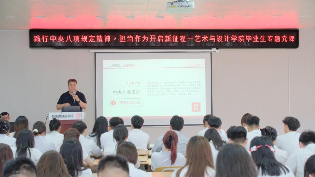 孙波从“何为八项规定”“何为中央八项规定精神”“如何贯彻中央八项规定精神”三个维度展开教育,系统阐释了中央八项规定精神的时代背景与深远意义。他结合党的十八大以来全面从严治党取得的显著成效,通过典型案例剖析与行业实际相结合的方式,深入解读了作风建设在艺术设计领域的具体体现,强调“艺术创作要扎根人民,设计服务要坚守底线”,要求毕业生党员始终以党性原则校准职业发展航向。他指出,中央八项规定是新时代全面从严治党的有力抓手,是加强作风建设的重要遵循,作为即将踏上工作岗位的毕业生党员,必须深刻领会中央八项规定精神,将其内化于心、外化于行。激励全体毕业生党员要以永不懈怠的精神状态和勇往直前的奋斗姿态,为实现中华民族伟大复兴的中国梦贡献青春力量,让党旗始终在奋斗征程上高高飘扬。