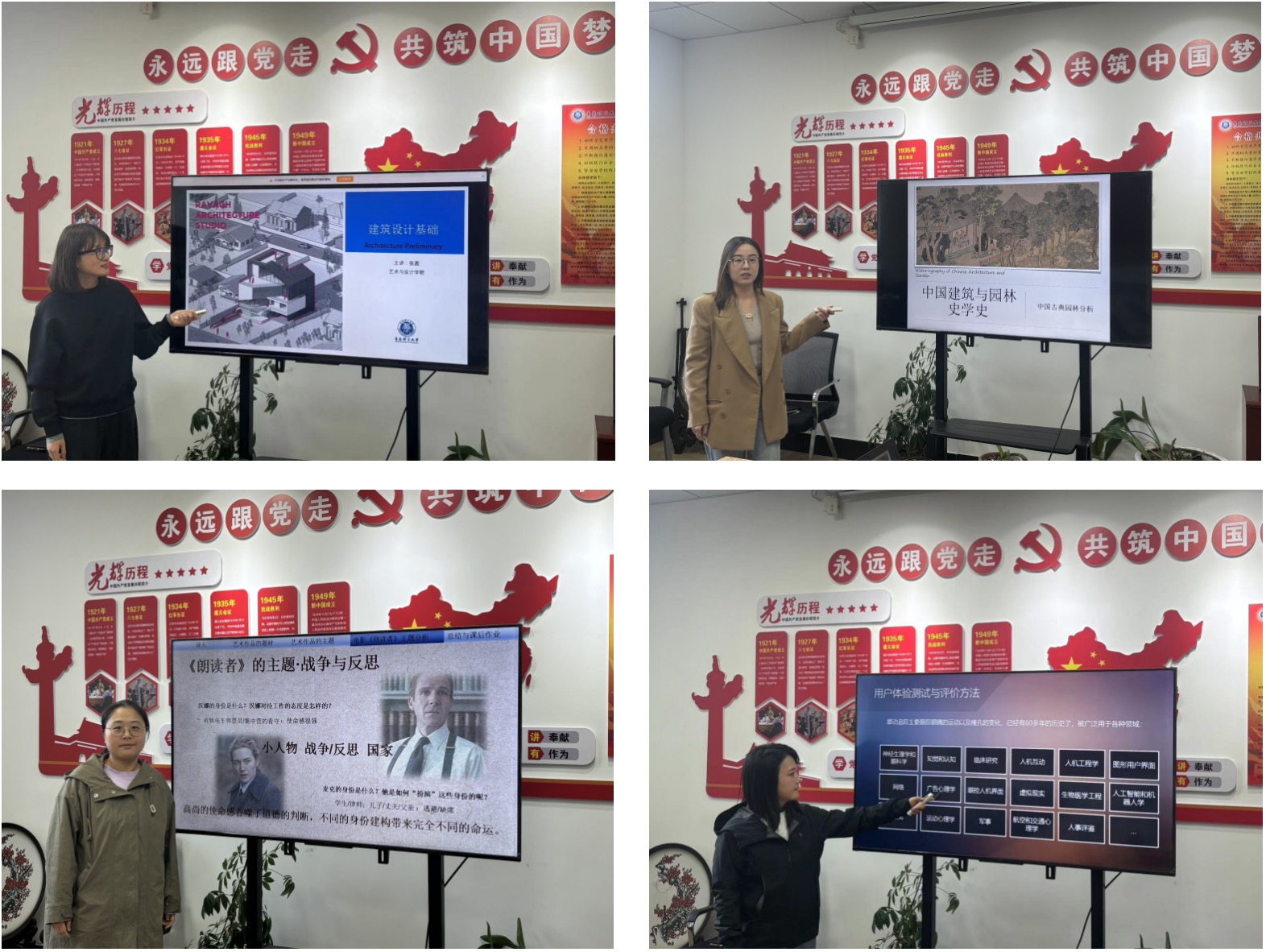 比赛中,教师们展现出扎实的教学功底和富有感染力的教学风采。张茜老师带来了《建筑设计基础》导学课,从远古构筑讲到现代主义建筑,深入浅出地阐释了建筑体量、样式和质感等核心概念。刘妍老师以《中国建筑与园林史学史》为题,详细讲述了中国营造学社的成立以及梁思成等先辈发现佛光寺、南禅寺等国宝古建的历程,展现了学科历史的深度。王雅鸣老师以电影《朗读者》为例,从爱情与成长、尊严与人性、战争与反思等多个维度进行剖析,探讨了“朗读”作为救赎的深层意蕴。金燕老师则着眼于前沿技术,讲授了《用户体验测试与评价方法》。她生动解释了“注视”与“跳动”等专业概念,结合多种方法展示了该技术在界面可用性测试和用户决策过程分析中的应用。