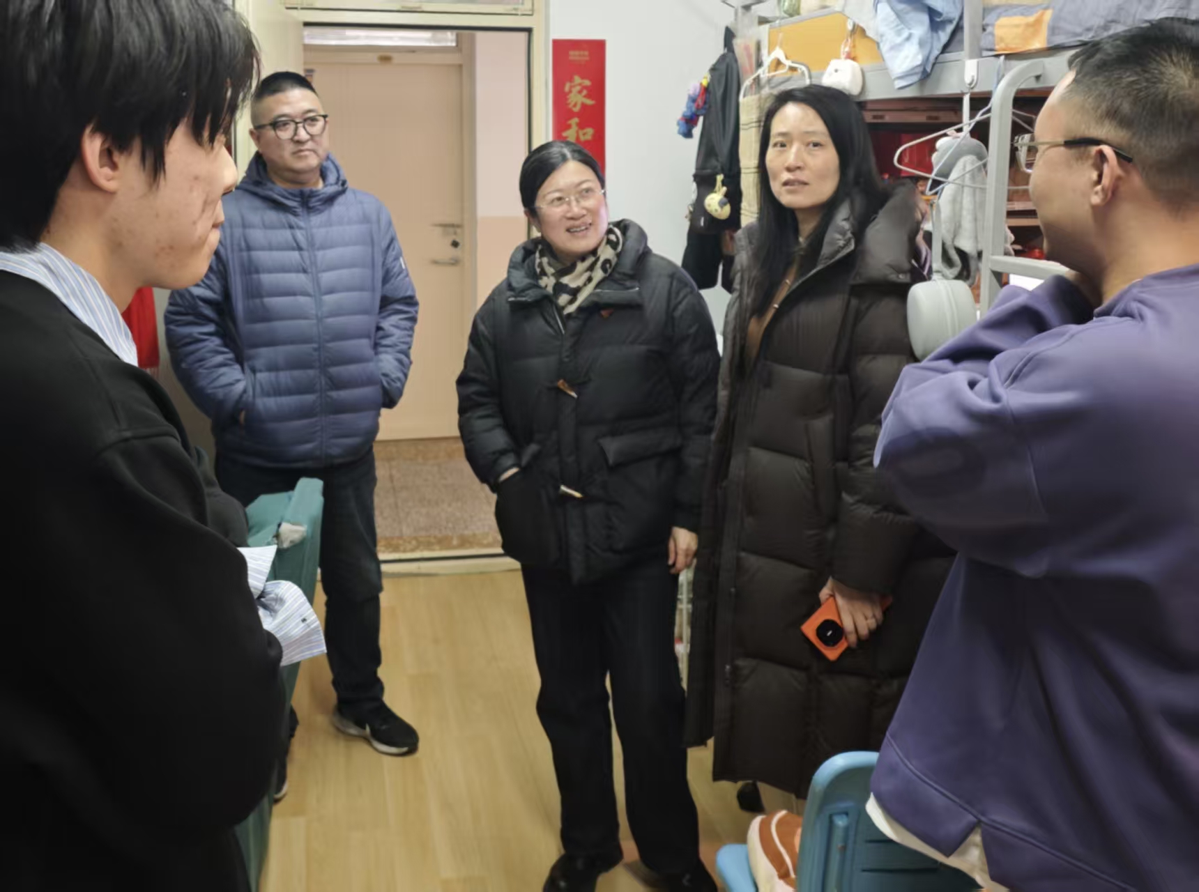 走访过程中,吕楠、朱宏轩、张恬及辅导员们走进宿舍,详细询问大家的假期生活、返校适应情况以及新学期的学习规划与生活诉求,亲切的交谈拉近了师生之间的距离。领导老师们仔细查看宿舍居住环境,排查用电安全、内务卫生等情况,反复叮嘱同学们要增强安全防范意识,保持宿舍整洁有序,养成良好的生活习惯,共同营造安全、文明、温馨的住宿氛围。