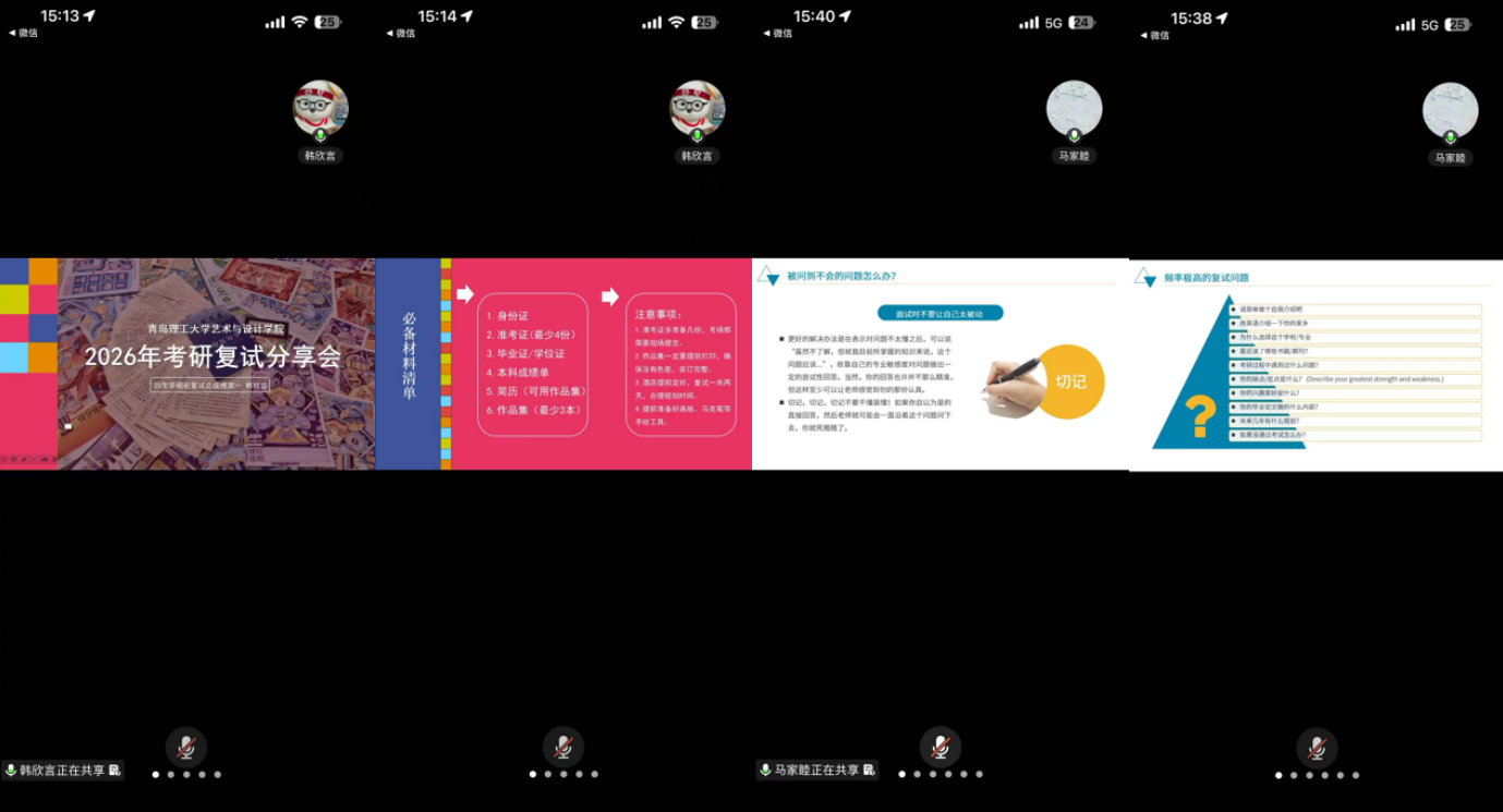 随后,五位优秀员工代表依次结合自身实战经验带来全方位复试备考干货分享:王亮聚焦实战演练,强调模拟面试对心态打磨的重要性,建议同学们组建模拟小组,针对高频考点反复练习,确保考场应答从容、逻辑清晰;丁钰分享结构化表达技巧,主推“总分总”作答逻辑凸显思维条理,叮嘱大家面对专业盲区坦诚应对,以诚恳好学的态度打造竞争优势;跨专业备考的魏东辰,重点讲解作品集编排与跨专业备考方法,提议核心作品前置凸显实力,巧用跨学科成果打造差异化亮点,还可借助AI工具模拟问答打磨思路;韩欣言针对综合面试与英语面试支招,专业面试需紧盯行业热点、结合真题针对性训练,英语面试要备好常考话题,注重表达流畅与发音标准;马家睦结合自身经历梳理调剂流程与策略,强调信息搜集的重要性,叮嘱大家拓宽信息渠道、了解导师研究方向,答题时注重展现思考过程与专业素养。
