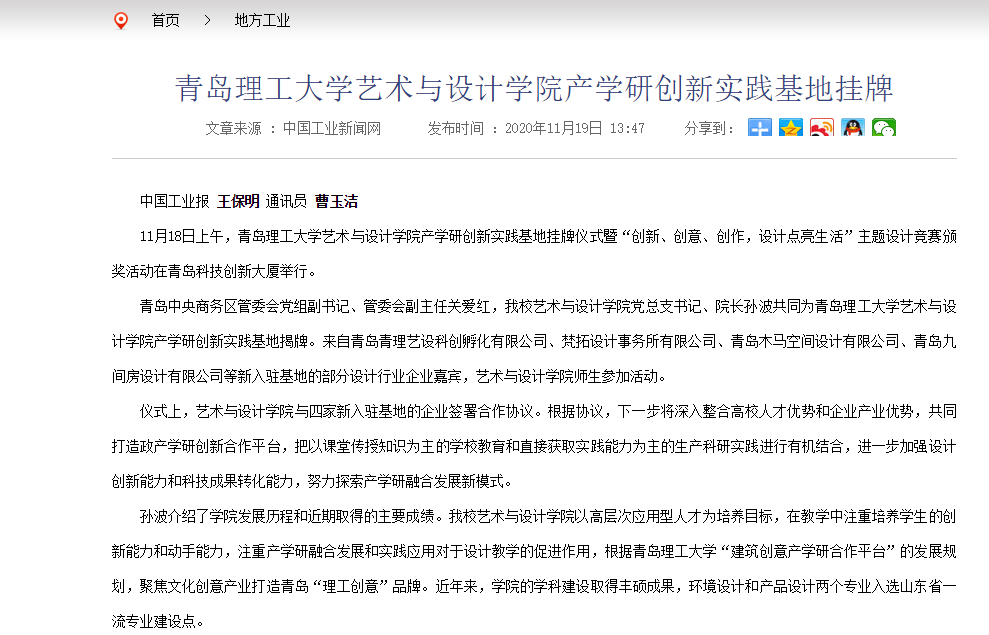 11月18日上午,伟德BV官网产学研创新实践基地挂牌仪式暨“创新、创意、创作,设计点亮生活”主题设计竞赛颁奖活动在青岛科技创新大厦举行。