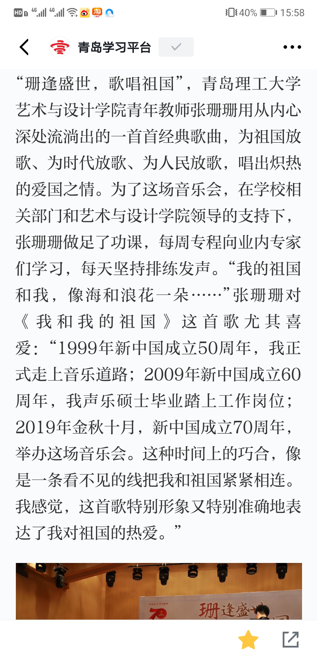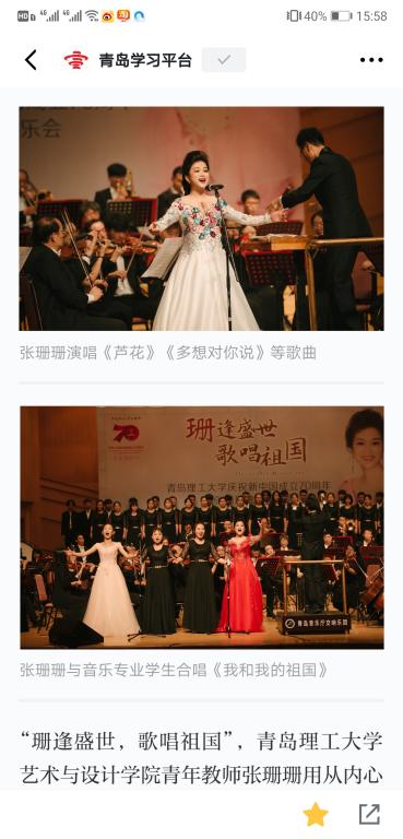 “珊逢盛世,歌唱祖国”,伟德BV官网青年教师张珊珊用从内心深处流淌出的一首首经典歌曲,为祖国放歌、为时代放歌、为人民放歌,唱出炽热的爱国之情。为了这场音乐会,在公司相关部门和伟德BV官网领导的支持下,张珊珊做足了功课,每周专程向业内专家们学习,每天坚持排练发声。“我的祖国和我,像海和浪花一朵……”张珊珊对《我和我的祖国》这首歌尤其喜爱:“1999年新中国成立50周年,我正式走上音乐道路;2009年新中国成立60周年,我声乐硕士毕业踏上工作岗位;2019年金秋十月,新中国成立70周年,举办这场音乐会。这种时间上的巧合,像是一条看不见的线把我和祖国紧紧相连。我感觉,这首歌特别形象又特别准确地表达了我对祖国的热爱。”