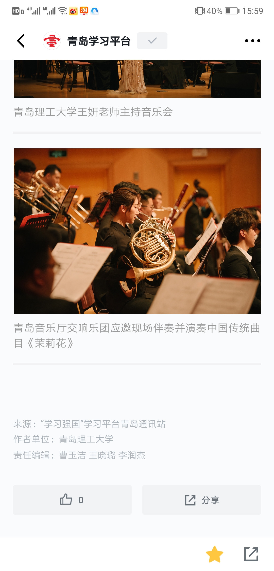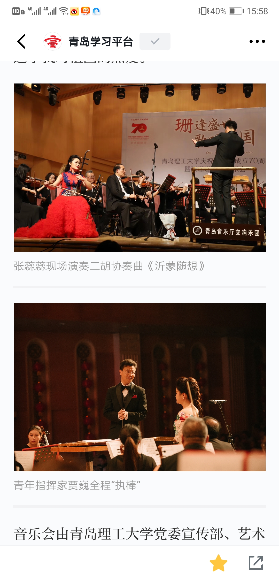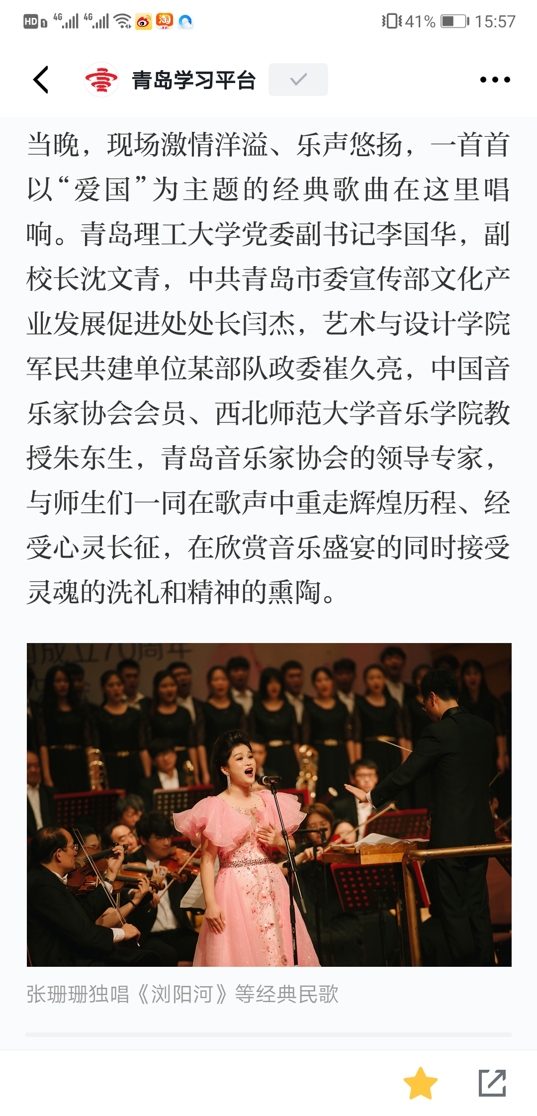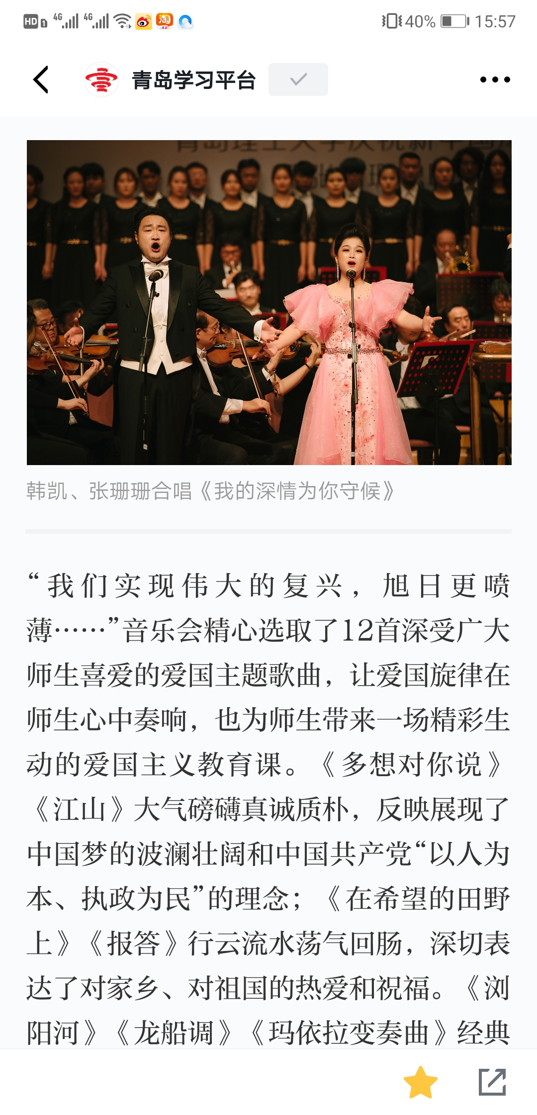“我们实现伟大的复兴,旭日更喷薄……”音乐会精心选取了12首深受广大师生喜爱的爱国主题歌曲,让爱国旋律在师生心中奏响,也为师生带来一场精彩生动的爱国主义教育课。《多想对你说》《江山》大气磅礴真诚质朴,反映展现了中国梦的波澜壮阔和中国共产党“以人为本、执政为民”的理念;《在希望的田野上》《报答》行云流水荡气回肠,深切表达了对家乡、对祖国的热爱和祝福。《浏阳河》《龙船调》《玛依拉变奏曲》经典民歌脍炙人口,《芦花》《玫瑰三愿》意境深远委婉动听,《我的深情为你守候》《我的爱将与你相伴终生》深沉执着隽永动人,从不同侧面歌颂伟大祖国的大好河山,歌颂新时代春潮涌动的蓬勃景象。作为演出嘉宾,伟德BV官网青年教师张蕊蕊现场演奏二胡协奏曲《沂蒙随想》,青年教师韩凯、张珊珊合唱了《我的深情为你守候》。青岛音乐厅交响乐团应邀现场伴奏并演奏中国传统曲目《茉莉花》,青年指挥家贾巍全程“执棒”,伟德BV官网伯牙员工室内合唱团伴唱。音乐会在台上歌唱、台下应和的一首《我和我的祖国》中落下帷幕。