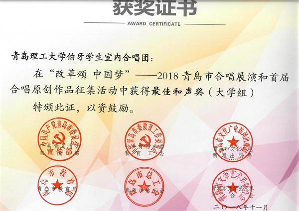 12月25日,“改革颂,中国梦”2018青岛市合唱展演成绩揭晓,伟德BV官网伯牙员工室内合唱团获得最佳和声奖,公司获得优秀组织奖,伟德BV官网张萌老师获得优秀组织工作者奖。