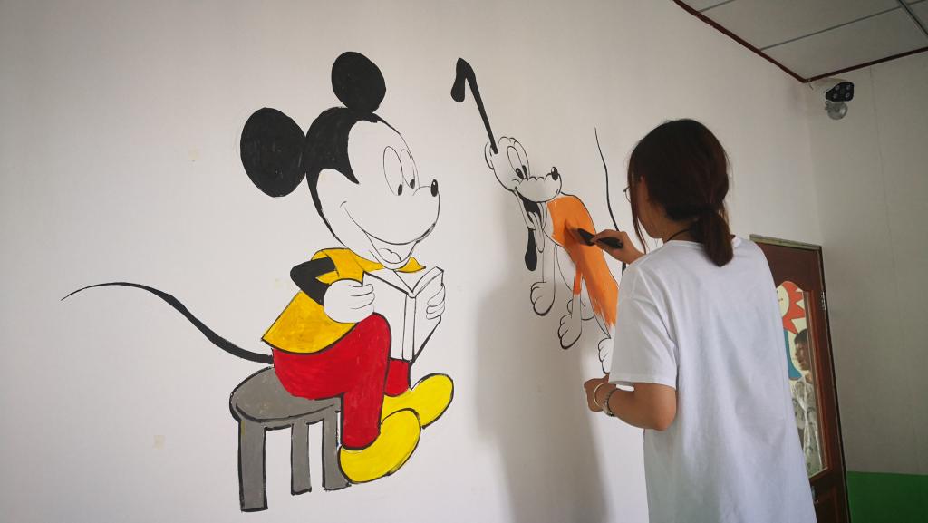 第二个项目是服务乡村精神文化建设。为进一步深化社区服务管理工作,更好地满足公司精神文化生活需求,提升公司同学的幸福指数,志愿者充分自己的的专业优势,对当地小学开展了绘制墙绘活动。志愿者们用自己的双手为建设美丽乡村贡献着自己的力量,经过一周的努力,校园面貌焕然一新。